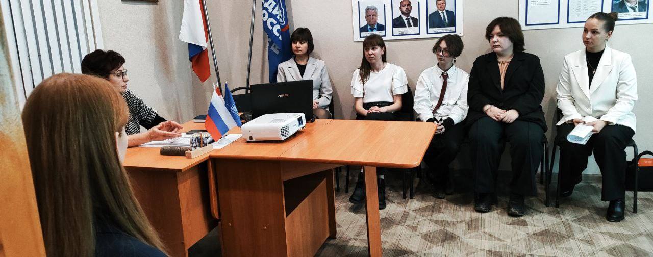 В рамках Декады приёмов граждан, приуроченной ко Дню рождения Партии, в общественной приёмной местного отделения Партии «ЕДИНАЯ РОССИЯ» прошла встреча заместителя Секретаря отделения Тарасовой М.А. с активистами «Молодой Гвардии».