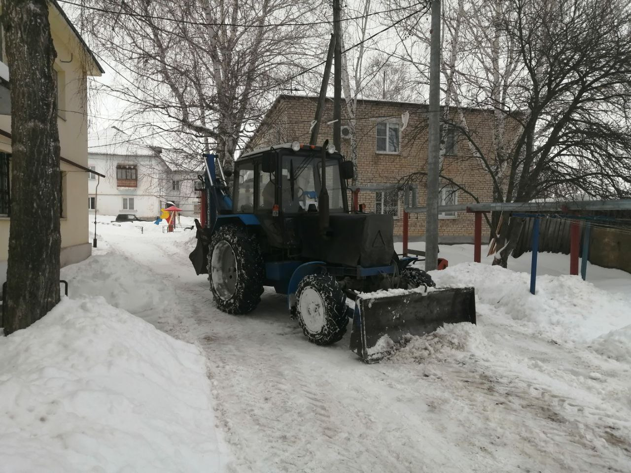 Механическая уборка снега обеспечивает беспрепятственный проход для пешеходов и проезд транспорта внутри двора многоквартирного дома.