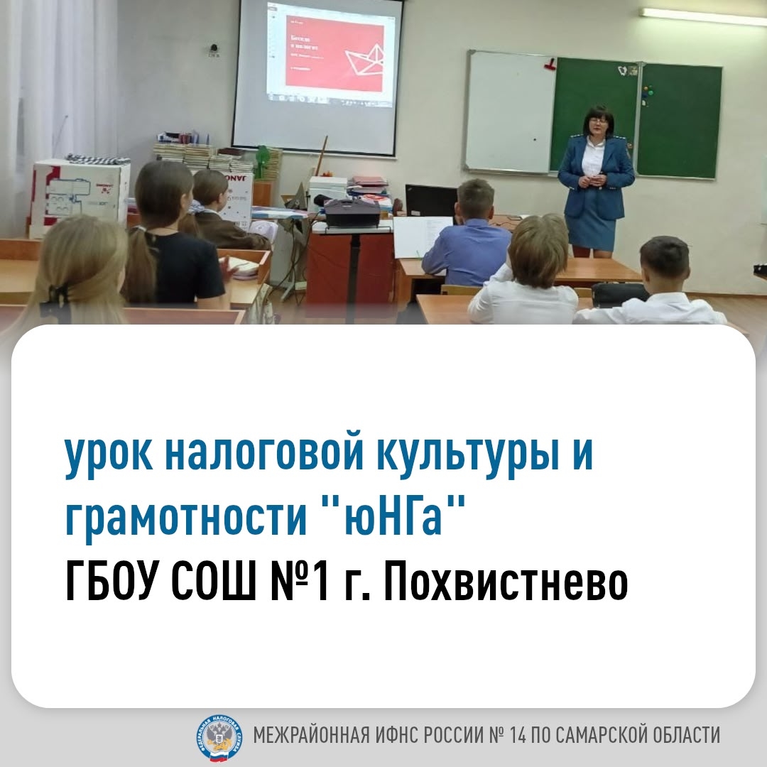 Старший государственный налоговый инспектор отдела учета и работы с налогоплательщиками - Климачева Анна Борисовна, провела урок налоговой культуры и грамотности "юНГа" для учащихся 6»а» класса в ГБОУ СОШ №1 «г. Похвистнево».