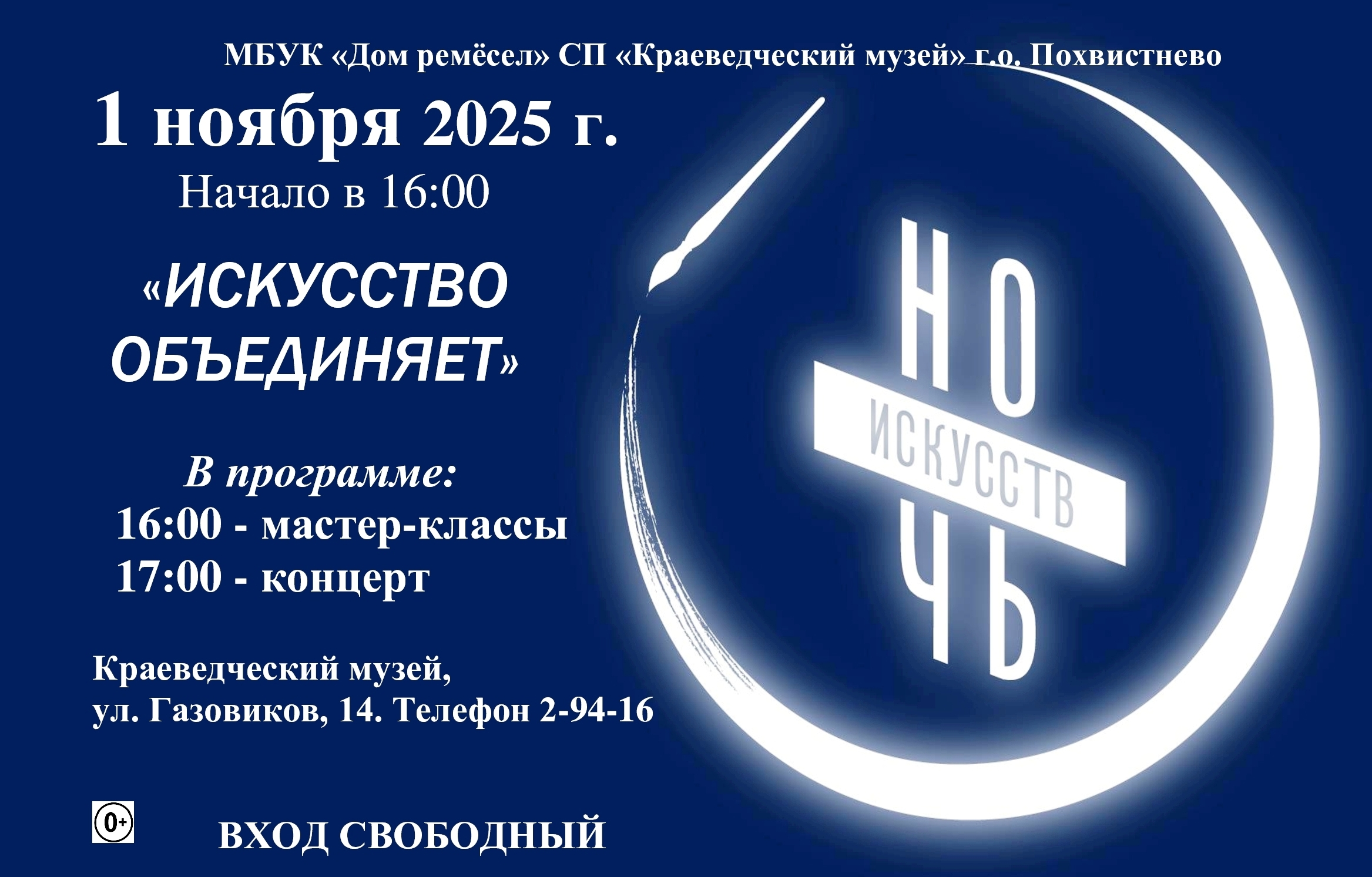 Отдел культуры Администрации г.о.Похвистнево информирует, что в рамках празднования Дня народного единства 1 ноября 2025 года пройдет ежегодная Всероссийская акция «Ночь искусств».