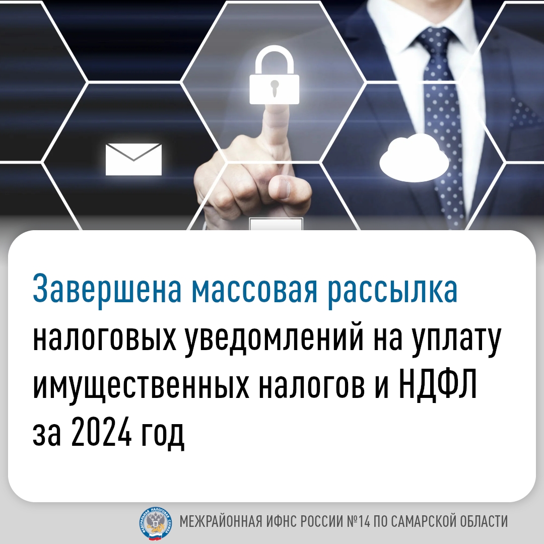 Межрайонная ИФНС России №14 по Самарской области информирует о завершении массовой рассылке налоговых уведомлений на уплату имущественных налогов и НДФЛ за 2024 год.