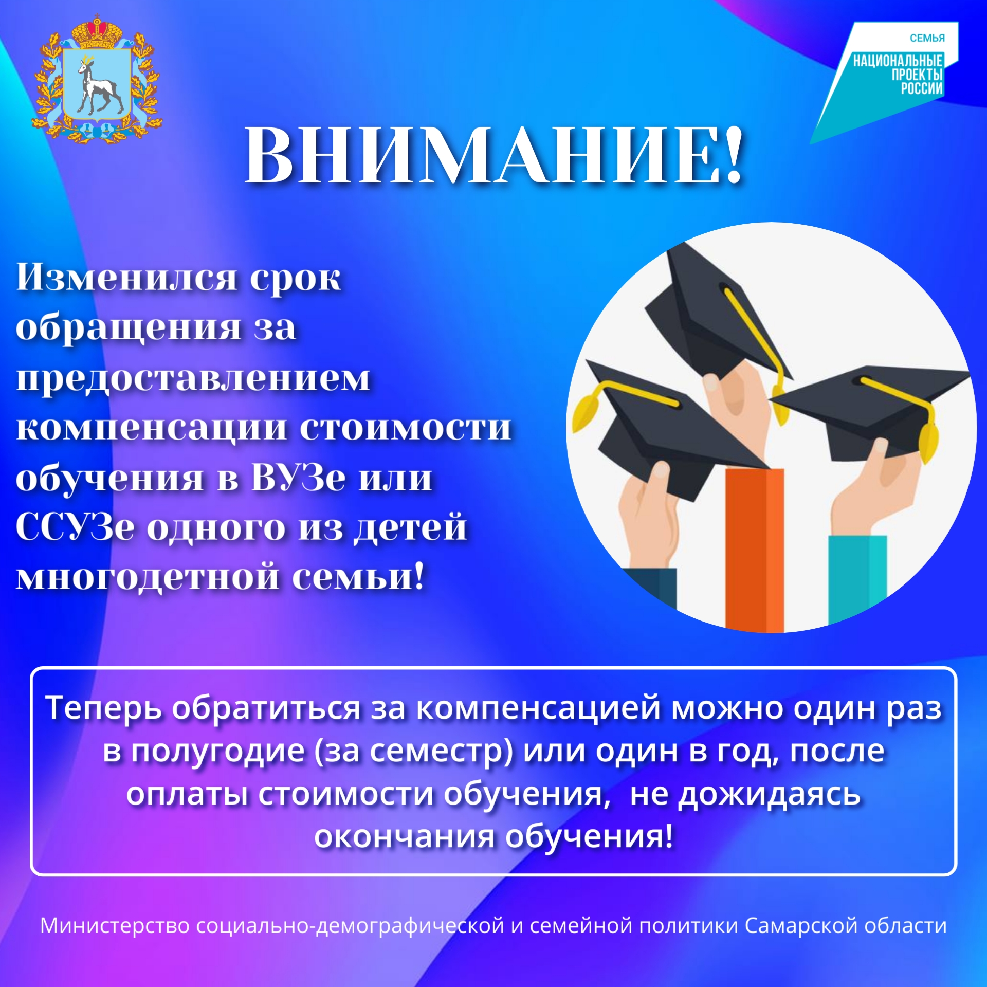 Изменился срок обращения за компенсацией стоимости обучения в ВУЗе или ССУЗе одного из детей многодетной семьи.