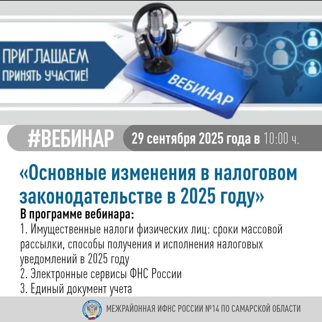 Межрайонная ИФНС России № 14 по Самарской области 29 сентября 2025 года в 10-00 ч. проведет вебинар для физических лиц по теме: «Основные изменения в налоговом законодательстве в 2025 году»