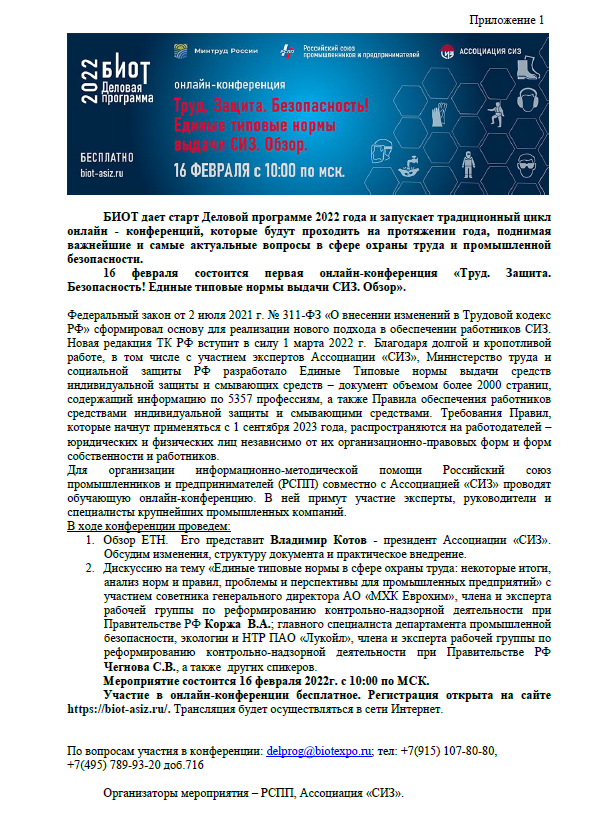 16 февраля 2022 года с 10.00 по мск (Деловая программа БИОТ-2022) Российский союз промышленников и предпринимателей совместно с Ассоциацией «СИЗ» проводит бесплатную онлайн-конференцию «Труд. Защита. Безопасность! Единые типовые нормы выдачи СИЗ. Обзор», на которой будут рассмотрены самые актуальные вопросы в сфере охраны труда и промышленной безопасности.
