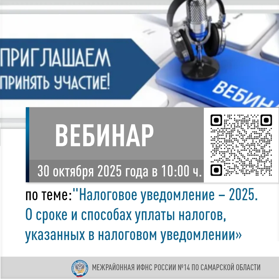 Межрайонная ИФНС России № 14 по Самарской области приглашает 30.10.2025г. в 10:00 часов принять участие в интерактивной встрече по теме: «Налоговое уведомление – 2025. О сроке и способах уплаты налогов, указанных в налоговом уведомлении».