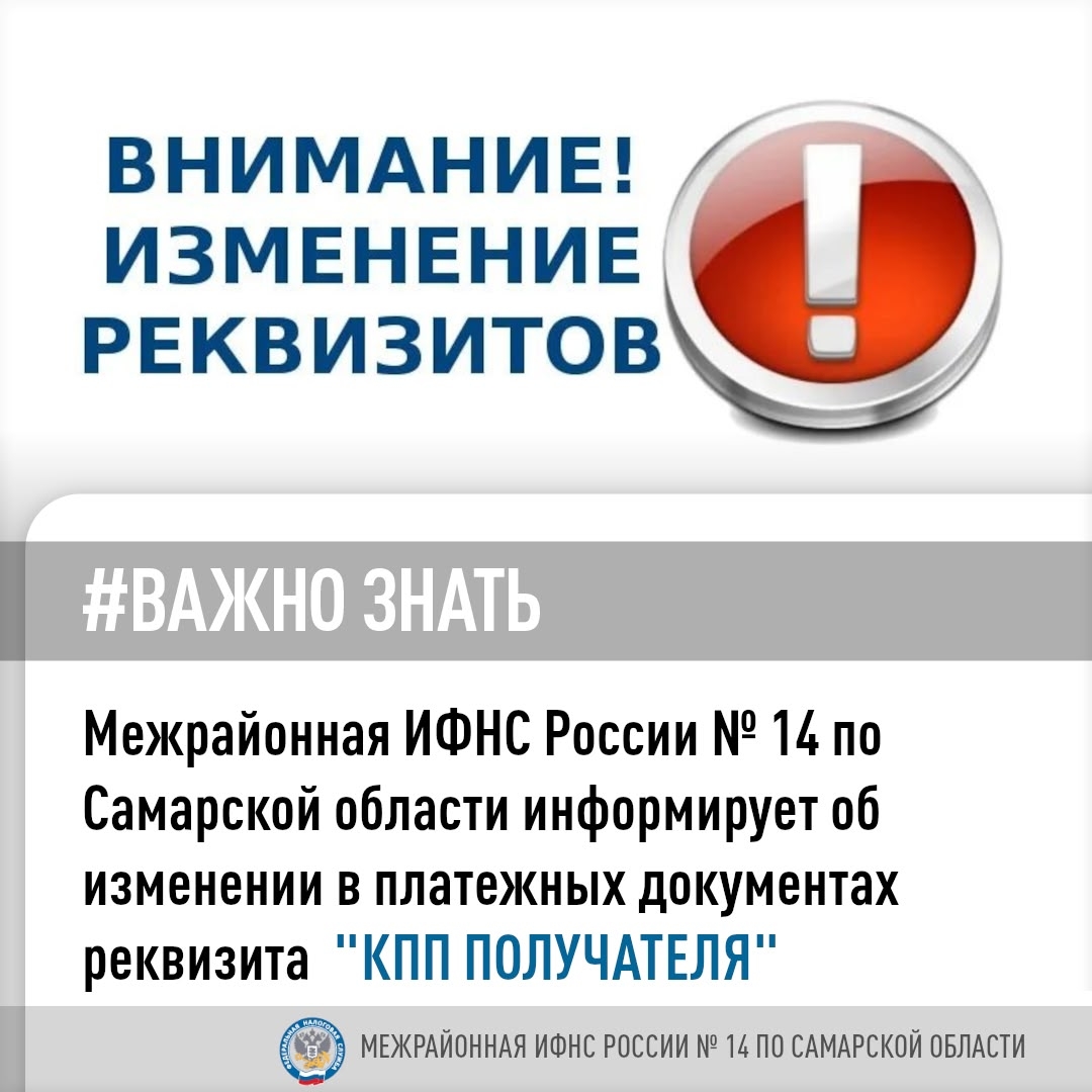 Межрайонная ИФНС России № 14 по Самарской области информирует об изменении с 5 декабря 2025 года КПП банка получателя налоговых платежей на 770701001.