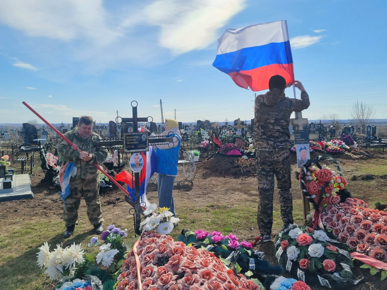 Участники мероприятия заменили изношенные российские триколоры на могилах погибших героев, установили новые флагштоки и ликвидировали накопившийся за зимний период мусор.