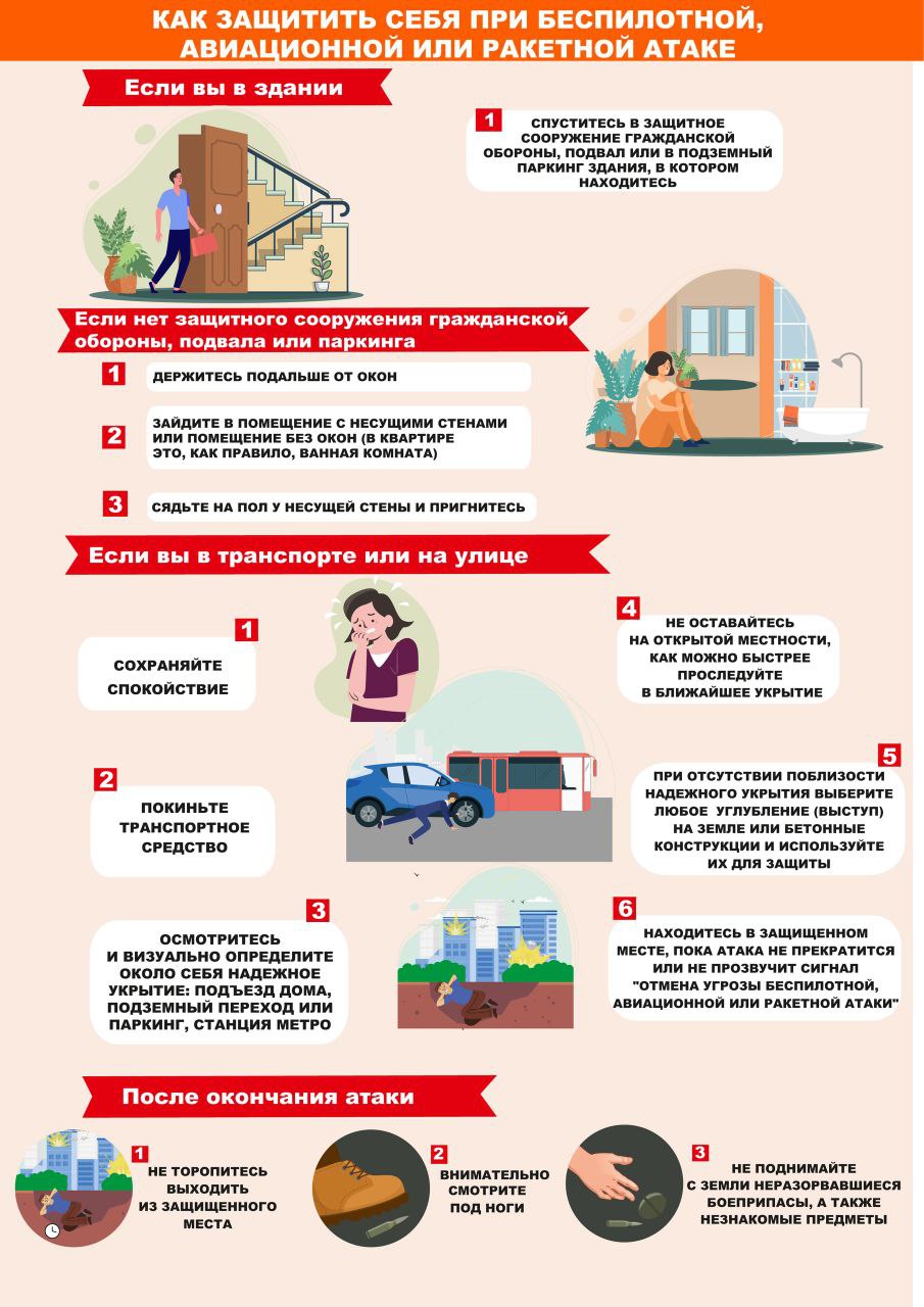 Из них вы узнаете, как защитить себя при беспилотной, авиационной или ракетной атаке, что делать , если прозвучал сигнал "Внимание всем" и что категорически запрещается делать при чрезвычайных ситуациях.